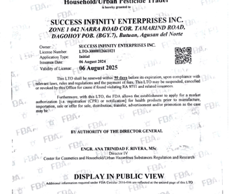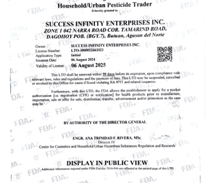 Furthermore, your safety and well-being are paramount. Every single one of our consumable products has passed the rigorous standards of the Food and Drug Administration (FDA), guaranteeing that what you bring into your home is not only effective but also completely safe for your family. On a local level, our operations are fully sanctioned with a Mayor's Permit, cementing our role as a responsible and contributing member of the community.